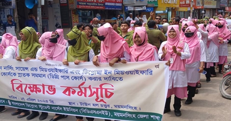 নিজস্ব প্রতিবেদক :: ডিপ্লোমা নার্সিং কোর্সকে স্নাতকের সমমান করার দাবিতে ময়মনসিংহে বিক্ষোভ মিছিল ও অবস্থান কর্মসূচি পালন করেছে বিভিন্ন নার্সিং কলেজের শিক্ষার্থীরা। আজ রোববার সকালে বাংলাদেশ ডিপ্লোমা স্টুডেন্ট নার্সেস ইউনিয়নের ব্যানারে ময়মনসিংহ মেডিকেল কলেজ ক্যাম্পাস থেকে একটি বিক্ষোভ মিছিল বের করে। মিছিলটি নগরীর প্রধান প্রধান সড়ক প্রদক্ষিণ করে টাউন হল চত্বরে অবস্থান নেন শিক্ষার্থীরা।