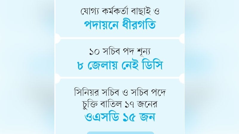এসব শূন্য পদ পূরণে তোড়জোড় নেই জনপ্রশাসন মন্ত্রণালয়ে। কোথাও কাউকে পদায়ন করার পরই আদেশ বাতিল করার ঘটনাও ঘটছে। এদিকে যুগ্ম সচিব ও উপসচিব পদে দুটি ব্যাচের বিপুলসংখ্যক কর্মকর্তা পদোন্নতির অপেক্ষায়। পদায়ন ও পদোন্নতির কাজে দক্ষতা দেখাতে না পারলেও, উল্টো জনপ্রশাসন মন্ত্রণালয়ের শীর্ষ কর্মকর্তারা নানা বিতর্কে নিজেদের জড়িয়ে ফেলছেন।