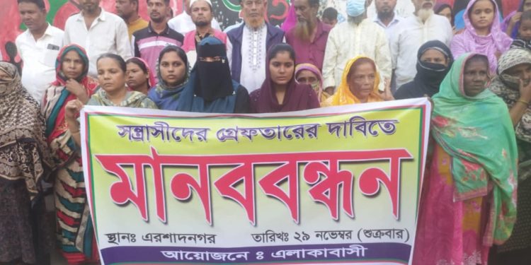 স্টাফ রিপোর্টার:: টঙ্গীতে  উত্তরা ক্রিডেন্স কলেজে ছাত্রী মাহফুজা আক্তার (১৭)উপর সন্ত্রাসী হামলার প্রতিবাদে মানববন্ধন করেছেন এলাকাবাসী। শুক্রবার (২৯ নভেম্বর ) বিকেলে গাজীপুর সিটি করপোরেশনের  ৪৯নং ওয়ার্ড এরশাদ নগর এলাকায় এ মানববন্ধন করা হয়। মানববন্ধনে বক্তরা বলেন, জুলাই আগস্টের ছাত্র-জনতার গণ অভ্যুত্থানের চেতনায় বাংলাদেশকে বৈষম্যহীন কল্যাণমূলক রাষ্ট্র বিনির্মাণ করার লক্ষে অন্তর্বর্তীকালীন সরকার কাজ করে যাচ্ছে। কিন্তু কিছু স্বার্থান্বেষী মহল নিজেদের আধিপত্য বিস্তার বজায় রাখার জন্য এলাকায় ত্রাসের রাজত্ব কায়েম করতে চাচ্ছে। এলাকায় মাদক, সন্ত্রাস, চাঁদাবাজি, জবরদখলসহ নানাবিধ অপকর্মে চালিয়ে যেতে জনমনে আতংক ছড়ানোর চেষ্টা চালাচ্ছে। আর কেউ তার প্রতিবাদ করলে তাকে হামলার স্বীকার হতে হচ্ছে। তেমনি সন্ত্রাসী হামলার স্বীকার হয়েছেন এরশাদনগর ৪নং ব্লকের বাসিন্দা মোবারক হোসেনর মেয়ে কলেজ ছাত্রী মাহফুজা। তাদের বাড়ির সামনে কতিপয়  সন্ত্রাসী  বোমা ও ককটেল বিস্ফোরণ ঘটায়। শব্দ পেয়ে কলেজ ছাত্রী মাহফুজা আক্তার বাসা থেকে বের হলে সন্ত্রাসীরা তার উপর হামলা চালায়। পরে এলাকাবাসি কলেজ ছাত্রী মাহফুজাকে আহত অবস্থায়  শহীদ আহসান উল্লাহ জেনারেল হাসপাতালে চিকিৎসার জন্য নিয়ে যায়। মানববন্ধনে এলাকাবাসী কলেজ ছাত্রী মাহফুজার উপর নেক্কারজনক হামলার প্রতিবাদ জানান এবং দোষীদের অতিসত্বর গ্রেফতারের দাবি জানান। মানববন্ধনে ভুক্তভোগীর মা বেলি আক্তার বলেন, আমার মেয়ে  মাহফুজা আক্তার উত্তরা ক্রিডেন্স কলেজের বানিজ্য বিভাগের ২য় বর্ষের ছাত্রী। বৈষম্য বিরোধী ছাত্র আন্দোলনে অন্যান্য শিক্ষার্থীদের মত আমার মেয়েও রাজপথে  আন্দোলনে  ছিল। ছাত্র-জনতার ত্যাগের বিনিময়ে আমরা একটা নতুন স্বাধীনদেশ পেয়েছি। সারাদেশ স্বাধীন হলেও আমাদের এরশাদ নগর এলাকা বোধ হয় এখনও স্বাধীন হয়নি। যার ফলশ্রুতিতে  গত মঙ্গলবার মিজান , মঞ্জু, কানা নুরু মিয়া, আনোয়ার , সুমন , চাঁন মিয়া, বাবু, শামীম, লিপু, রশিদ, রিপন  মইজ উদ্দিনসহ অজ্ঞাতনামা ৮/১০ জন সন্ত্রাসী আমার বাসার সামনে এসে বোমা বিস্ফোরণ  ঘটায়। শব্দ পেয়ে আমার মেয়ে মাহফুজা আক্তার  বাসা থেকে বের হয়ে দেখতে পায় তারা একটি ছেলেকে মারধর করে নিয়ে যাচ্ছে, আমার মেয়ে তৎক্ষনাৎ প্রতিবাদ জানালে তার উপরও সন্ত্রাসীরা হামলা চালায় এবং ককটেল বিস্ফোরণ ও হামলার বিষয়ে কাউকে কিছু না বলার জন্য হুমকি প্রদান করে। বর্তমানে আমি ও আমার পরিবার জীবনের ঝুঁকির মধ্যে আছি। আমি ও আমার পরিবার বর্তমান অন্তর্বর্তীকালীন সরকারের কাছে  জীবনের নিরাপত্তা চাচ্ছি এবং সন্ত্রাসীদের দ্রুত গ্রেফতারের দাবি জানাই।