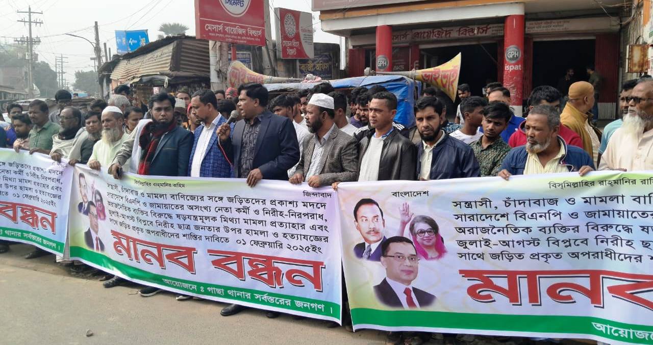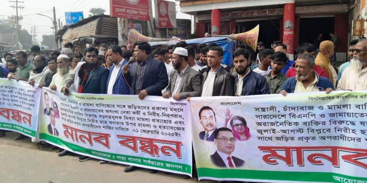 স্টাফ রিপোর্টার :: গাজীপুরে বিএনপি ও জামায়াতের অসংখ্য নেতা কর্মী ও নিরীহ ব্যক্তিদের বিরুদ্ধে ষড়যন্ত্রমূলক মিথ্যা মামলা প্রত্যাহারের দাবিতে মানবন্ধন করেছে স্থানীয় বিএনপি নেতাকর্মীরা। এছাড়া জুলাই-আগস্ট বিপ্লবে নিরীহ ছাত্র জনতার উপর হামলা ও হত্যার সাথে জড়িতদের শাস্তির দাবি জানান। গতকাল শনিবার দুপুরে গাজীপুর মহানগরীর গাছা থানার জাঝর বিশ্বরোড এলাকায় গাজীপুর জেলা শ্রমিক দলের সাবেক সভাপতি ও প্রধান সমন্বয়ক বাংলাদেশ কৃষি ফার্ম আকতারুজ্জামান বাবুল এর সভাপতিত্বে মানববন্ধনে বক্তব্য রাখেন মহানগর বিএনপি’র সাবেক প্রকাশনা সম্পাদক আজিজুল হক রাজু মাস্টার, ৩২ নং ওয়ার্ড বিএনপি’র সভাপতি হামিদ মন্ডল, টঙ্গী পাইলট স্কুল এন্ড গার্লস কলেজের সিনিয়র শিক্ষক মো: রেজানুর ইসলাম, জামাল উদ্দিনসহ স্থানীয় নেতাকর্মীরা।