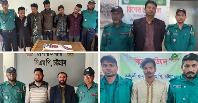 গ্রেফতারকৃতরা হলো, বাকলিয়া থানার আসামি দীপন ধর (৪০), মো. ফারুখ (৪৫), মো. ইমরান হোসেন (৩২), মো. মনির আলম (৩৩), চান্দগাঁও থানার আসামি পেয়ার আহমেদ (৪৫), মো. আব্দুর রহিম (৩৭), চকবাজার থানার আসামি মোহাম্মদ নাসির উদ্দিন চৌধুরী (৫২), পাহাড়তলী থানার আসামি মামুনুর রশিদ পাভেল (২১), ডবলমুরিং থানার আসামি শুক্কুর আহমেদ ওরফে মো. ফয়সাল (২২), সদরঘাট থানার আসামি আলী মর্তুজা (৩৫), নগরীর ৩০নং ওয়ার্ড স্বেচ্ছাসেবকলীগের প্রচার সম্পাদক শাহাজাহান ইসলাম সাজু (২৮), ২৯ নং ওয়ার্ড যুবলীগের সহ-সম্পাদক মো. নাহিদুল আলম এলিন (৪৩), সদরঘাট থানার ঘাট গুদাম শ্রমিক লীগের যুগ্ম সম্পাদক মো. সফর আলী (৩৯), বায়েজিদ বোস্তামী থানার আসামি মো. ইকবাল হোসেন (৩৫), ৪৩ নং আমিন শিল্পাঞ্চল সাংগঠনিক ওয়ার্ড আওয়ামী লীগের সাবেক সহ সভাপতি মো. নুরুল আলম (৬২), হালিশহর থানার আসামি মো. রুবেল মিয়া (২৬), পতেঙ্গা থানার আসামি মো. আব্দুর রউফ বাদশা (১৯), পাঁচলাইশ থানার আসামি মো. ওসমান গণি ওরফে ইমন (২৪), এ এন মেহেদী ইসলাম বাপ্পী (৪৪), খুলশী থানার আসামি মো. রফিক (৪০), কর্ণফুলী থানার আসামি বড় উঠান ইউনিয়নের ০৭নং ওয়ার্ড, যুবলীগের সংগঠক মো. রাকিব (২৪), আকবরশাহ থানার আসামি চট্টগ্রাম মহানগরের ০৯নং উত্তর পাহাড়তলী ওয়ার্ডের আওয়ামীলীগের সভাপতি জুলফিকার আলী মাসুদ (৫০), কোতোয়ালী থানার আসামি মো. সাইফুল ইসলাম (৪৭), মোহাম্মদ আরশাদুল নুর (২০), আবুল কাসেম (৪৫) ও অবৈধ অস্ত্রধারী মো. আকবর হোসেন (২৫), ইমাম হোসেন ওরফে ইব্রাহীম (২৫), মো. বেলাল (৩৩), মো. রুবেল (২৭) এবং মো. আলমগীর হোসেন (৩৬)।