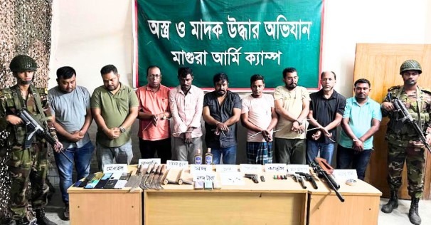 নিজস্ব প্রতিবেদক:: মাগুরায় সেনা ক্যাম্পের কর্মকর্তারা তাদের গোয়েন্দা সূত্রে প্রাপ্ত তথ্যের ভিত্তিতে যৌথ অভিযান চালিয়ে অস্ত্র-মাদকসহ ৯ জনকে গ্রেফতার করেছেন। ক্যাম্পের গোয়েন্দা কর্তৃক গৃহীত তথ্যের ভিত্তিতে জানা যায় যে, মাগুরা জেলার সদর থানার অন্তর্গত পারলা এলাকায় অস্ত্রসহ মো. ফরিদ হাসান খান অবস্থান করছেন। এরই সূত্র ধরে বুধবার (০৯ এপ্রিল) দিবাগত রাত ১ টায় বিএ ৭৩৩২ লেফটেন্যান্ট কর্নেল আনন্দ মোস্তফা মিশু, পিএসসি, অধিনায়ক, ১৪ বীরের সার্বিক নেতৃত্বে ১৪ বীর কর্তৃক উক্ত এলাকায় অস্ত্র অভিযান পরিচালনা করা হয়।