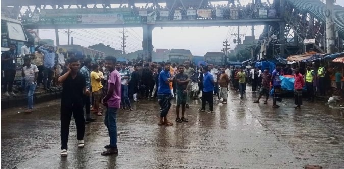 বৃষ্টি উপেক্ষা করেই বকেয়া বেতনের দাবিতে শ্রীপুরে শ্রমিকদের অবরোধ