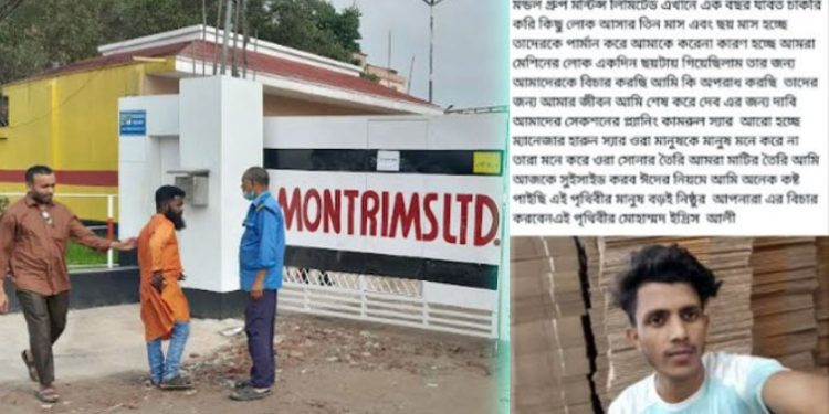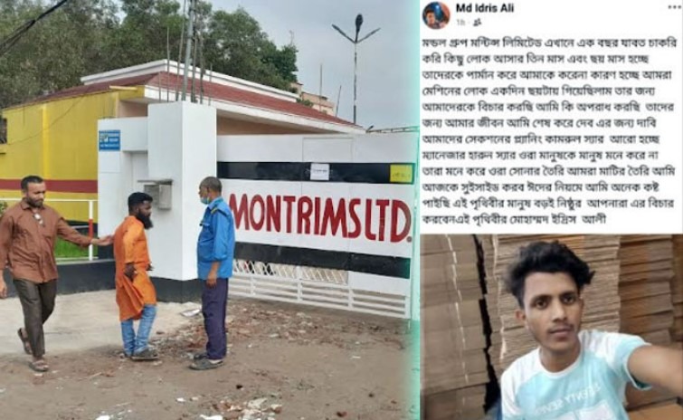 স্টাফ রিপোর্টার:: গাজীপুরের কালিয়াকৈর উপজেলার মৌচাক এলাকায় মন্ট্রিমস লিমিটেড নামে একটি কারখানার শ্রমিক কর্তৃপক্ষের স্বেচ্ছাচারিতার বিরুদ্ধে ফেসবুকে পোস্ট দিয়ে আত্মহত্যা করেছে। এ ঘটনার পর থেকে কারখানার ছুটি ঘোষণা করা হয়েছে। কারখানার কার্টন সেকশনে কাজ করা ওই শ্রমিকের নাম মোহাম্মদ ইদ্রিস আলী (২৩)। তিনি স্থানীয় নিশ্চিন্তপুর এলাকায় বসবাস করতেন। তার গ্রামের বাড়ি নীলফামারী জেলায়।