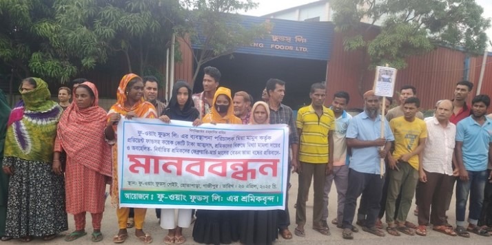 স্টাফ রিপোর্টার, গাজীপুর :: গাজীপুর সদর উপজেলার হোতাপাড়ায় ফু-ওয়াং ফুডস লিমিটেড কারখানার পরিচালকের বিরুদ্ধে শ্রমিকের প্রভিডেন্ট ফান্ডের কোটি টাকা আত্মসাৎ ও বেতন-বোনাস না দেওয়ার অভিযোগ তুলে বিক্ষোভ ও মানববন্ধন করেছে প্রতিষ্ঠানটির শ্রমিকরা। আজ রোববার (২০ এপ্রিল) দুপুর ১২টায় ঢাকা-ময়মনসিংহ মহাসড়কের পাশে কারখানার প্রধান ফটকের সামনে কয়েকশো শ্রমিক ওই কর্মসূচিতে অংশ নেন।