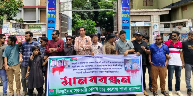 ঝিনাইদহ বিশেষ প্রতিনিধি, মোঃ ফজলুল কবির গামা:- বেসরকারি বিশ্ববিদ্যালয় ছাত্রদল নেতা ও প্রাইম এশিয়া বিশ্ববিদ্যালয়ের শিক্ষার্থী জাহিদুল ইসলাম পারভেজ হত্যার প্রতিবাদ এবং হত্যাকারী সন্ত্রাসীদের দ্রুত গ্রেপ্তার ও দৃষ্টান্তমূলক শাস্তি নিশ্চিতের দাবিতে ঝিনাইদহ কেসি কলেজ ছাত্রদলের মানববন্ধন কর্মসূচি পালিত হয়েছে। সোমবার সকালে ঝিনাইদহ কেসি কলেজ গেটে ঘন্টা ব্যাপী এ মানববন্ধন কর্মসূচি পালিত হয়। সেসময় উপস্থিত ছিলেন, জেলা ছাত্রদলের সাধারণ সম্পাদক মুশফিকুর রহমান মানিক, সহ-সভাপতি ও সাবেক ভারপ্রাপ্ত সভাপতি ইমরান হোসেন, সহ-সভাপতি আব্দুস সালাম, সাংগঠনিক সম্পাদক শাহেদ আহমেদ, যুগ্ম-সম্পাদক রাজ হিমেল, সদর থানা ছাত্রদলের আহবায়ক মামুনুর রহমান মামুন, কেসি কলেজ ছাত্রদলের আহবায়ক শিমুল আল-মাসুদ, সদস্য সচিব মেহেদী হাসান, যুগ্ম-সম্পাদক মেহেদী হাসান লাবিবসহ অন্যান্যরা উপস্থিত ছিলেন। বক্তারা ছাত্রদল নেতা ও প্রাইম এশিয়া বিশ্ববিদ্যালয়ের শিক্ষার্থী জাহিদুল ইসলাম পারভেজ হত্যার সাথে জড়িতদের দ্রুত বিচারের আওতায় এনে সর্বোচ্চ শাস্তি নিশ্চিত করার দাবি জানান।